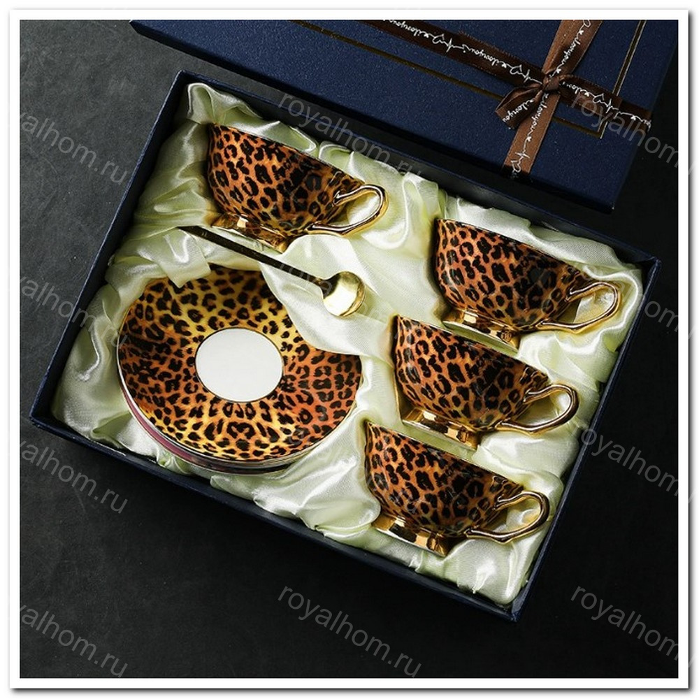 Чайный набор на 4 персоны в стиле Versace с леопардовым принтом и золотыми ручками