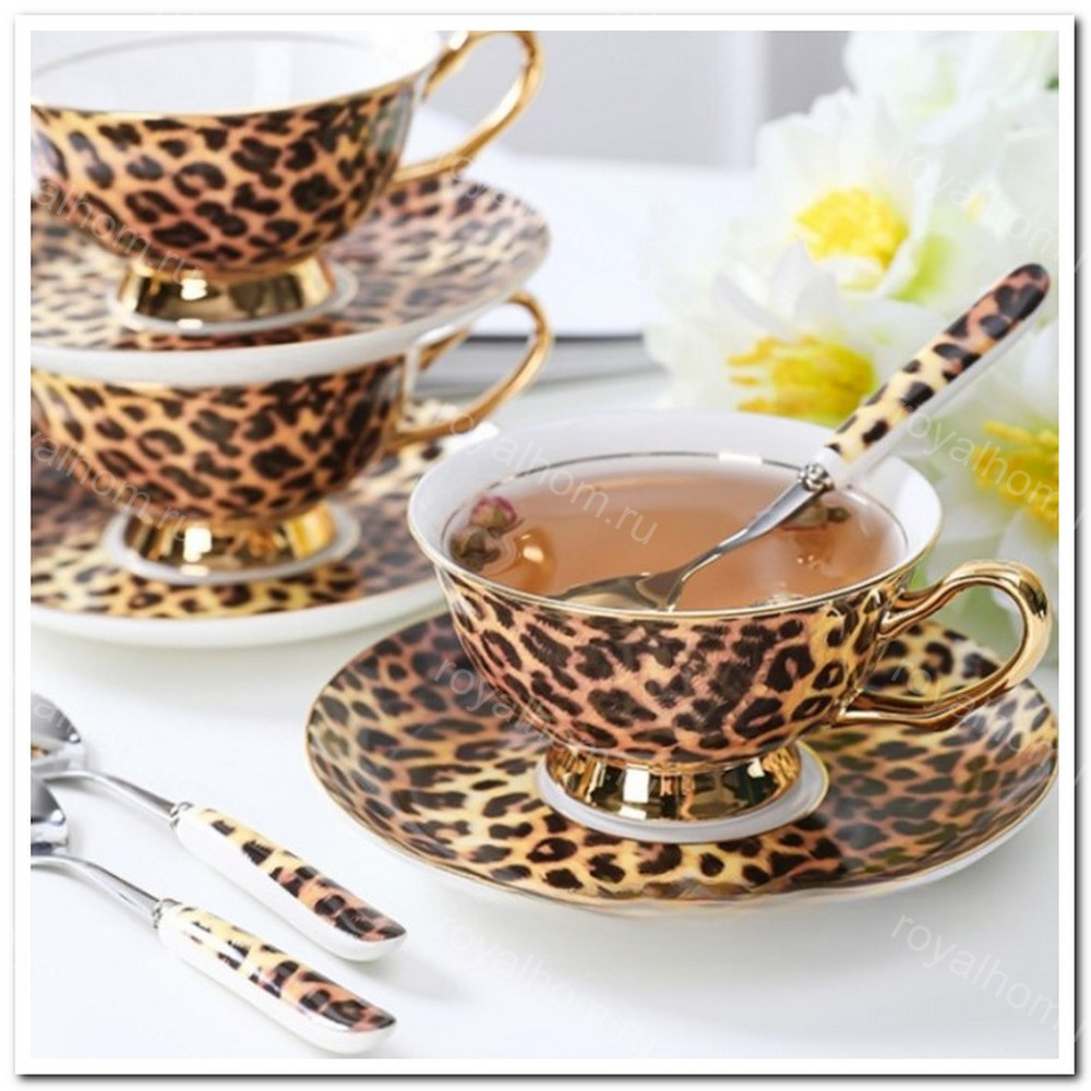 Чайный набор на 6 персон в стиле Versace с леопардовым принтом и золотыми ручками