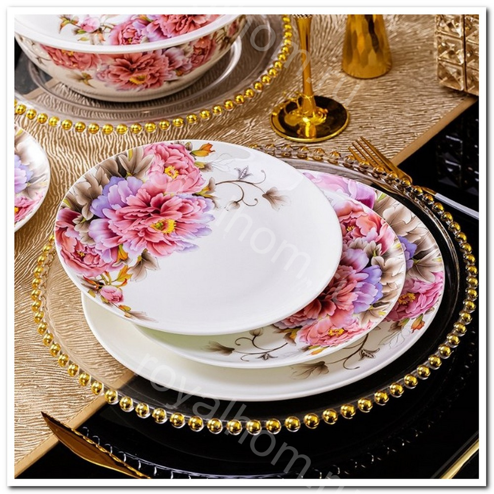 Изысканный столовый сервиз из высококачественного фарфора с элегантной росписью цветов – это идеальный выбор для торжественных мероприятий, семейных ужинов и уютных вечеров с друзьями. Сервиз включает 22 предметов, позволяя создать стильную сервировку для любого случая.